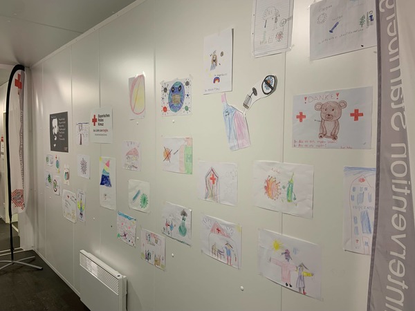 Super sind auch die Kinderzeichnungen, die jetzt schon die Wände schmücken. Jedes Kinder, das zum Impfen ein selbstgemaltes Bild mitbringt bekommt ein kleine Überraschung, damit unsere Wände noch viel bunter werden. Die kleinen Künstler konnten sich anschließend noch bei Kinderpunsch und Plätzchen stärken und mit Ehrenamtlichen des BRK Starnberg, die auf dem Parkplatz zur Besichtigung bereit gestellten Fahrzeuge, wie das Einsatzleitfahrzeug, den Bus der Bereitschaft Herrsching und das Fahrzeug des Kriseninterventionsteams (KIT) besichtigen. Sogar ein Boot der Wasserwacht stand zum Erkunden bereit.