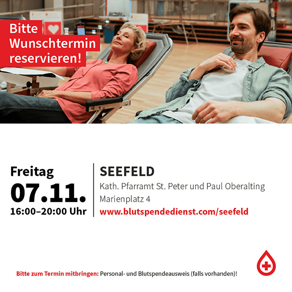 Schon seit Jahren unterstützt die Bereitschaft Seefeld des BRK den Blutspendedienst des Bayerischen Roten Kreuzes bei der Durchführung und Organisation der Blutspenden in Seefeld/Hechendorf. Der nächste Termin findet am Freitag, den 07.11.2025 wieder im Katholischen Pfarramt Oberalting im Haus „Peter und Paul“ von 16 – 20 Uhr statt. Die Adresse lautet wie folgt: