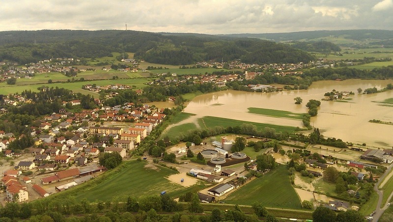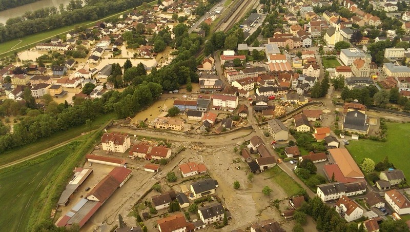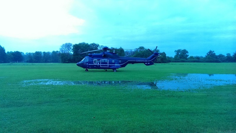 Nach einer Einsatzbesprechung macht sich der Hubschrauber auf den Weg nach Simbach um den dort vom Hochwasser betroffenen Menschen zu helfen. Die stellenweise sehr starken Niederschläge am Mittwoch in bestimmten Teilen des Landkreises Rottal-Inn haben dafür gesorgt, das innerhalb weniger Stunden im Landkreis eine Katastrope besonderen Ausmaßes begonnen hat. Neben den Luftrettern der anderen Rettungsorganisationen wurden auch die Luftretter der Wasserwacht eingesetzt um Bewohner aus vom Hochwasser eingeschlossenen Häusern zu retten.