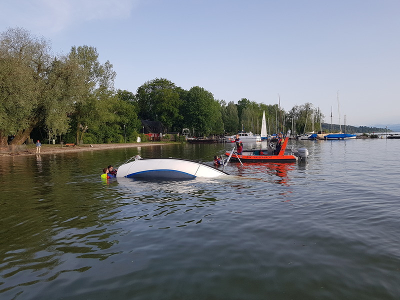 Die Besatzung konnte sich gerade noch unter das Armaturenbrett des Bootes retten und sich mit Jacken, Helmen und den bereit liegenden Neoprens vor den Einschlägen schützen. Zwei Einsatzkräfte erlitten durch den Hagel Prellungen an Armen und Beinen. Nach 20 Minuten war alles vorbei und der See präsentierte sich wieder von seiner friedlichen Seite. Wir konnten dann auch wieder ausrücken und wurden durch die Einsatzleitung zu zwei Suchen in Breitbrunn und Utting alarmiert, die jedoch beide glimpflich ausgingen. Die beiden vermissten Segler wurden bereits durch ein anderes Motorboot in Sicherheit gebracht und das losgerissene Boot vor Utting wurde bereits durch ein Boot des Segelclubs geschleppt. Als beide Einsätze abgearbeitet waren, haben wir noch die Wasserwacht Herrsching bei einer Bootsbergung mit unseren Hebesäcken sowie unserer Pumpe unterstützt.